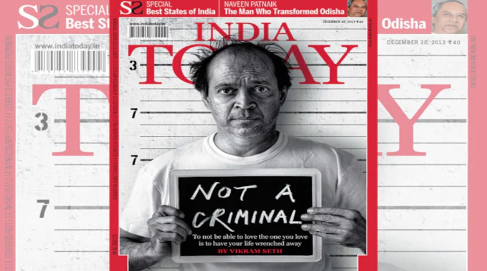 The most powerful depiction of this language was on the cover of India Today in December 2013: a photo of Vikram Seth holding a slate on which is written – “Not a Criminal: To not be able to love the one you love is to have your life wrenched away, said Seth.” The “one” that one “loves” might now be a same-sex one, but it can still only be one and you have to make sure that you love it.