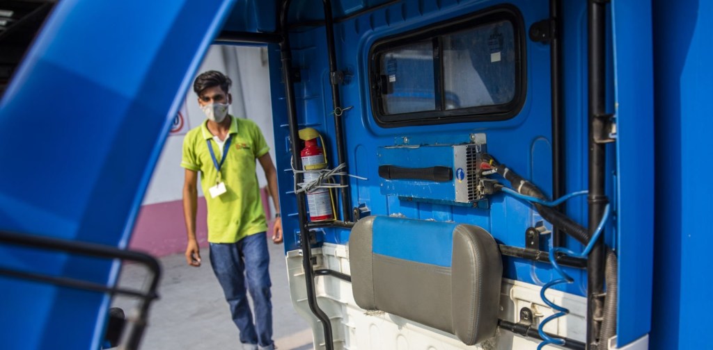 An electric vehicle sits in a bay at a charging station operated by Energy Efficiency Services Ltd. (EESL), a joint venture between four state-run power companies – NTPC Ltd., Power Grid Corp., Power Finance Corp. and REC Ltd., in New Delhi, India. (Photo by T. Narayan/Bloomberg)